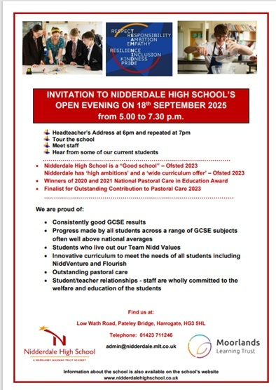 The outdoor environment and the local community are considered an opportunity for active learning for our students. School grounds have been developed so they can enrich different curriculum areas, particularly outdoor education provision through a number of subject areas. There are opportunities both within the curriculum and also under the developing NiddVenture programmes which incorporate a wide range of subjects and activities. Learners have access to good quality educational experiences beyond the classroom walls, and for engaging in new developments in various subjects integrated into the curriculum. Bespoke interventions allow for students to experience exceptional pastoral care throughout their school experience. The pastoral care within school has also been recognised nationally for excellence and innovation. Nidderdale High School takes pride in providing a highly inclusive environment, where learners demonstrate high levels of enjoyment in their education while also making very good progress across that curriculum. All staff play an important part in the success of the curriculum by leading a regular programme of monitoring, evaluation and review and the celebration of good practice contributes to the ongoing commitment to evolve and improve further.
